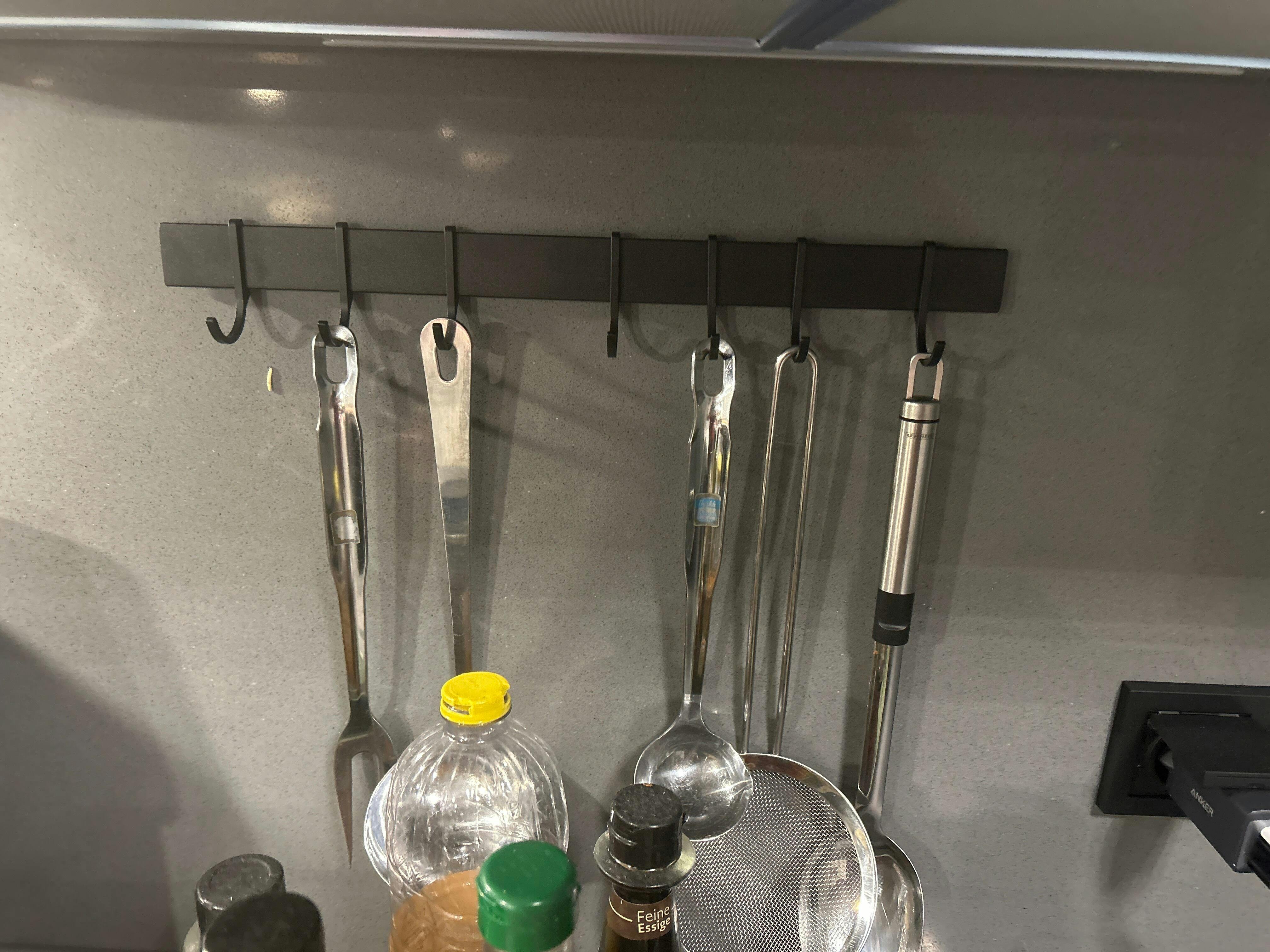Say goodbye to overflowing cutlery drawers or messy kitchen utensil containers! Our easy-to-install and rock-solid kitchen rail is here to make your life easier and your kitchen tidier. No drilling, no damage – simply attach the self-adhesive pads to the black kitchen rail, supplement with the included liquid adhesive if necessary, and after just 24 hours, you can securely mount your kitchen utensils. And if you ever want to remodel, you can remove the rail without damaging the surface. It couldn't be easier!