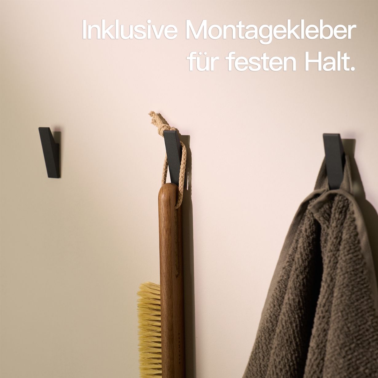 Installation? Super easy! No drilling , no tools, no stress. Simply apply the adhesive, press it down, and everything's rock-solid . Our hooks stay securely in place thanks to the strong adhesive combination – no more unsightly, wobbly towel hooks!