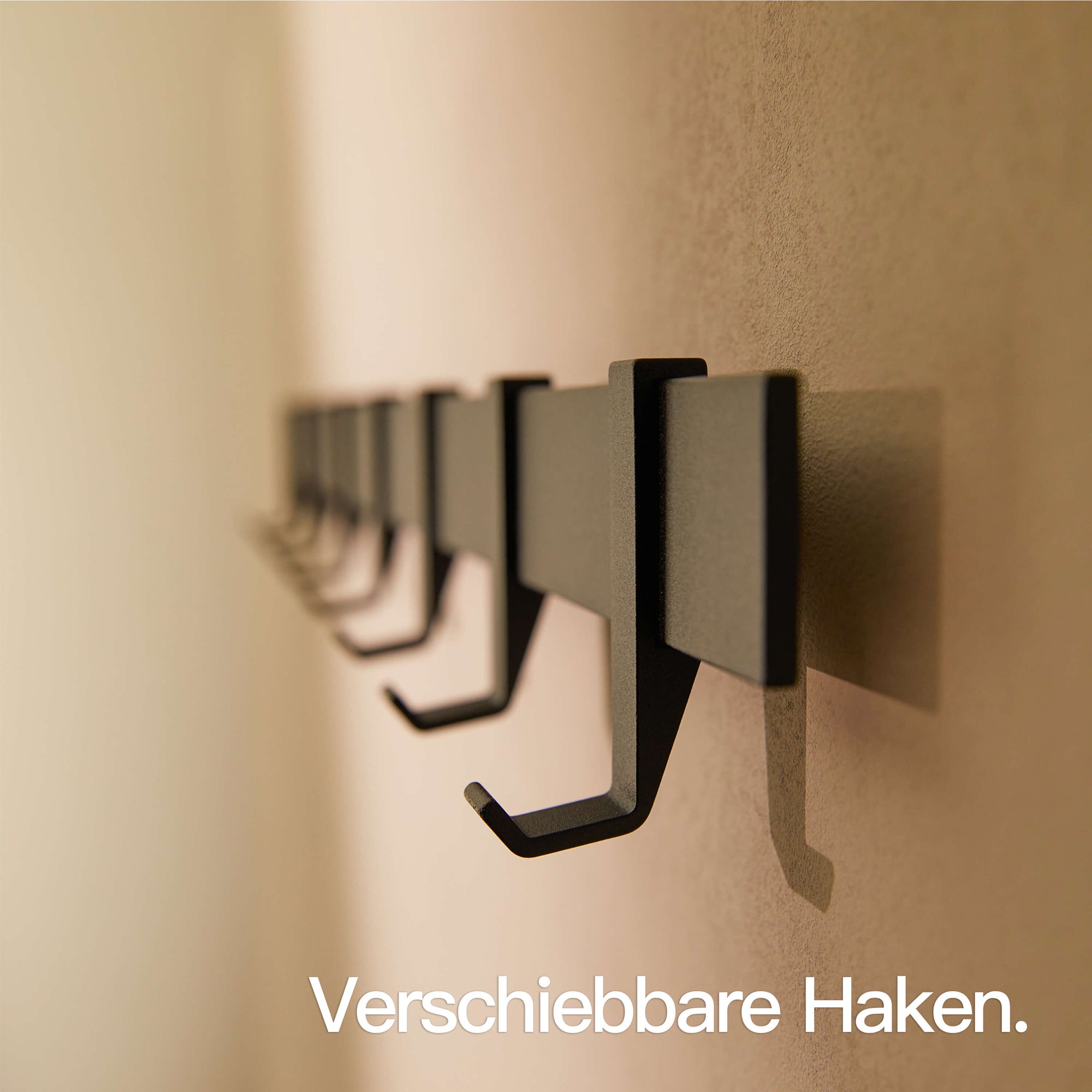 Our hook rail is made of high-quality rolled aluminum , which is given a simple, matte finish through sandblasting and powder coating . This not only gives the clothes rail an aesthetic appearance, but also ensures that it is rust-free and scratch-resistant. With a material thickness of 5 mm, it offers remarkable resilience without appearing obtrusive and gives it an incomparable quality.