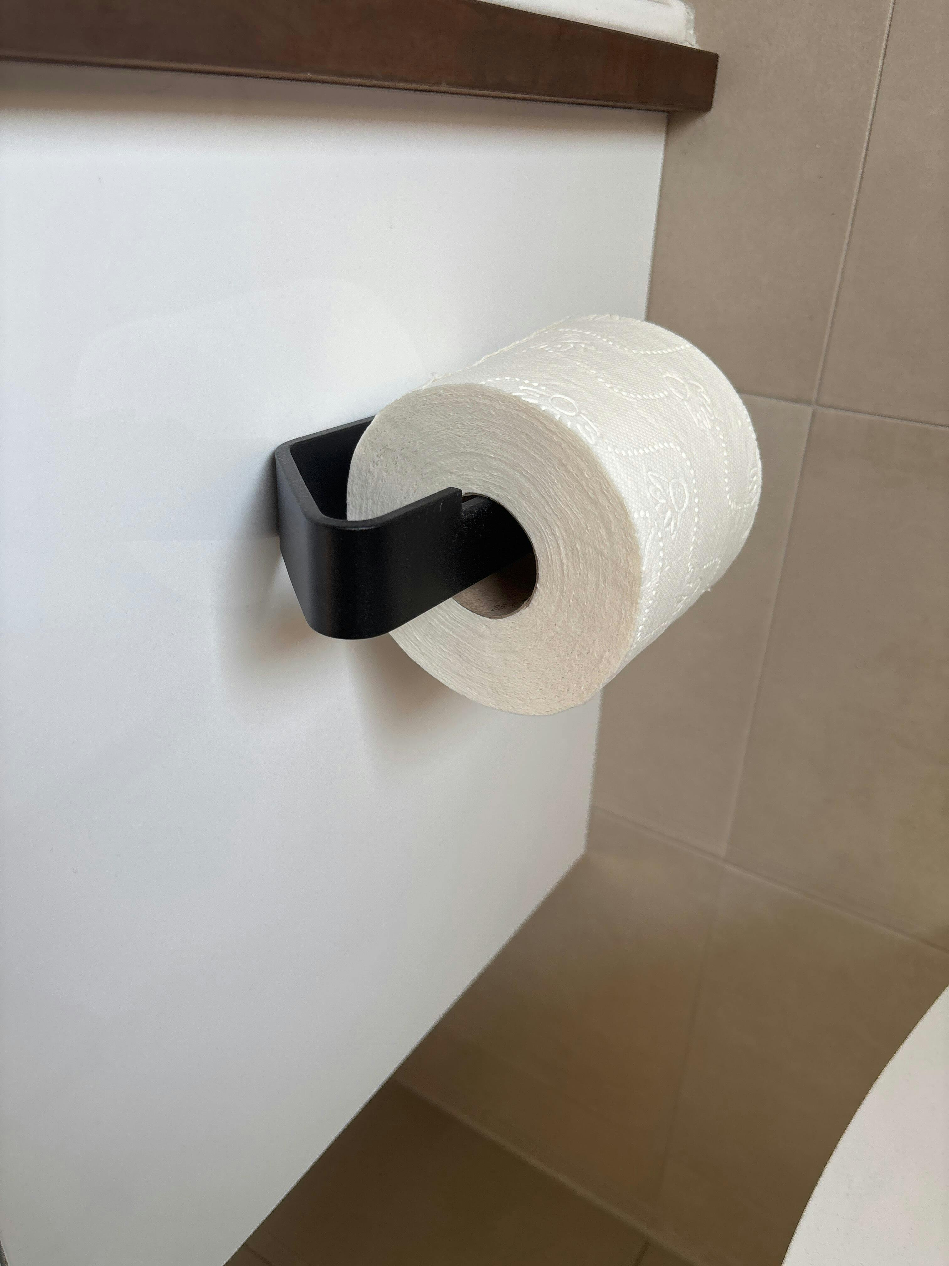 A toilet paper holder with a minimalist and modern design, crafted from a single piece of metal with high-quality craftsmanship. The edges are elaborately CNC-milled, creating a clean yet unique look. May we introduce: our no-drill toilet paper holder in matte black.