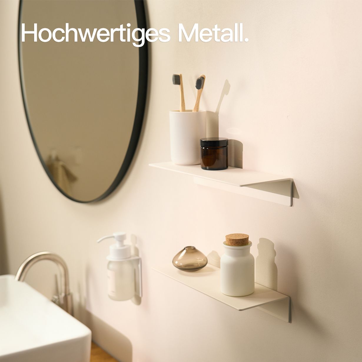 Are you looking for a space-saving and stylish solution for your bathroom or kitchen – without any drills or dowels? The adhesive shelf from Designfabrik Hamburg is exactly that: clever, high-quality, and understated.