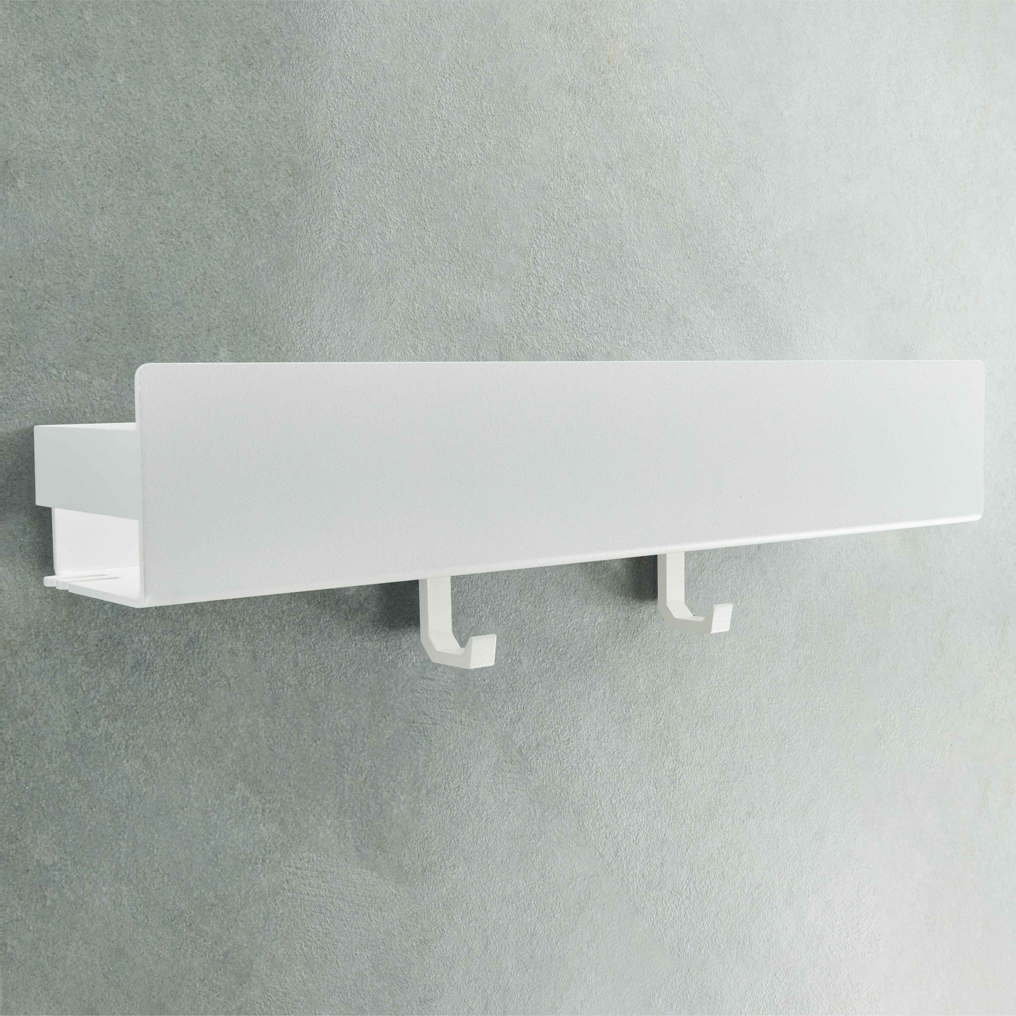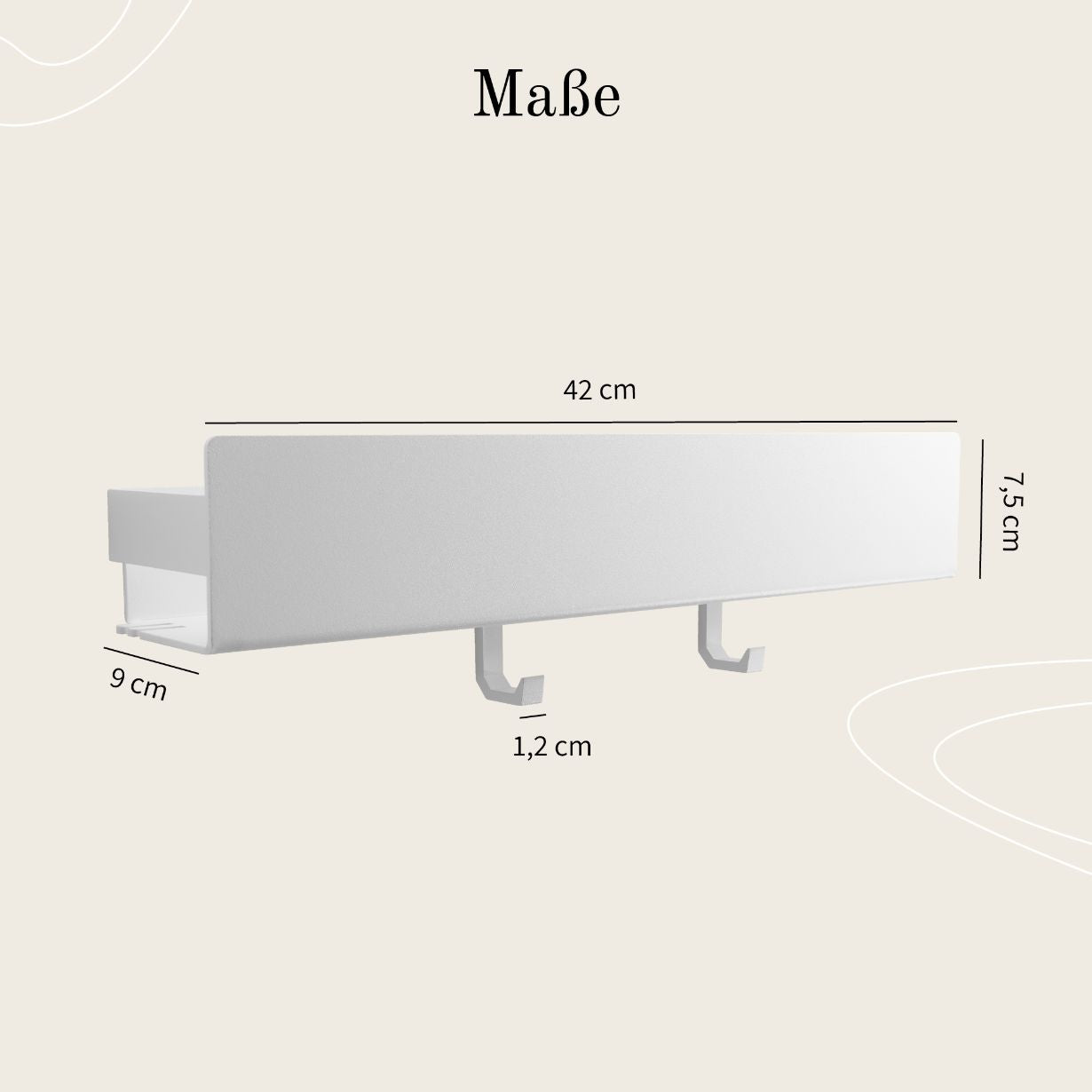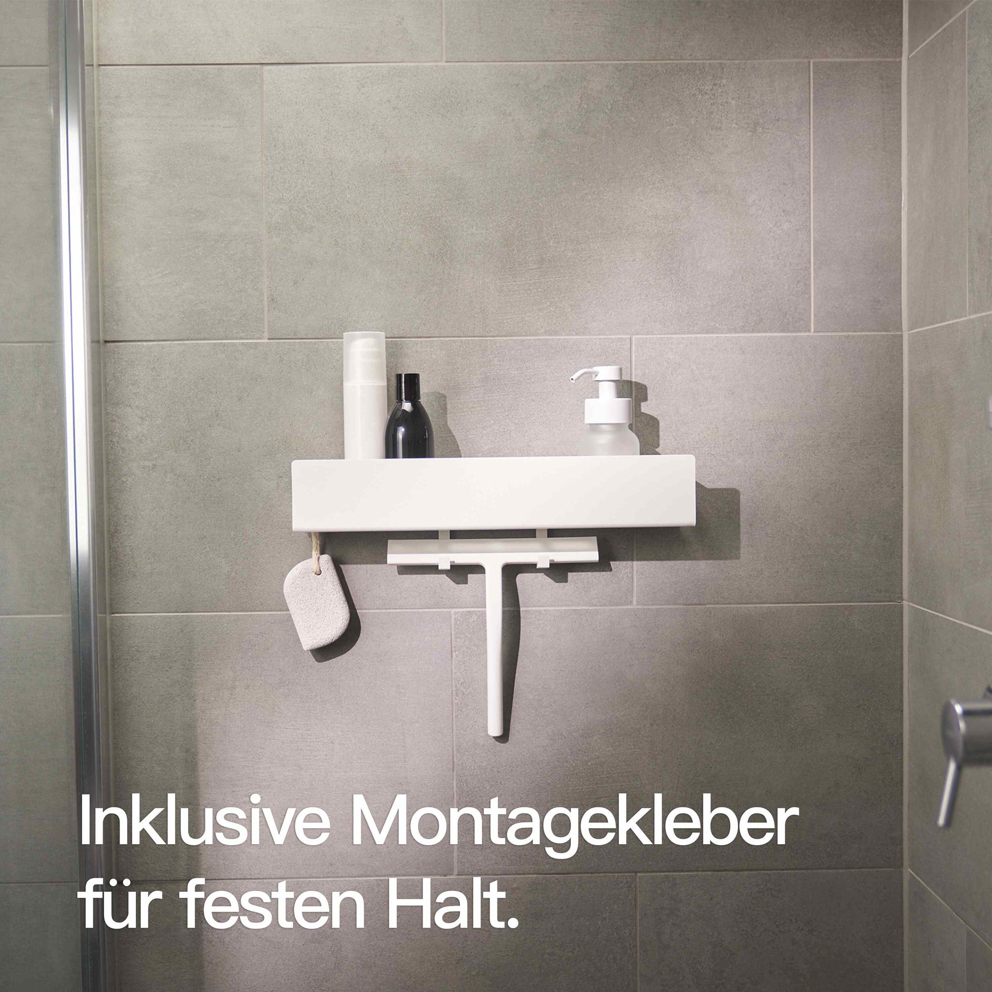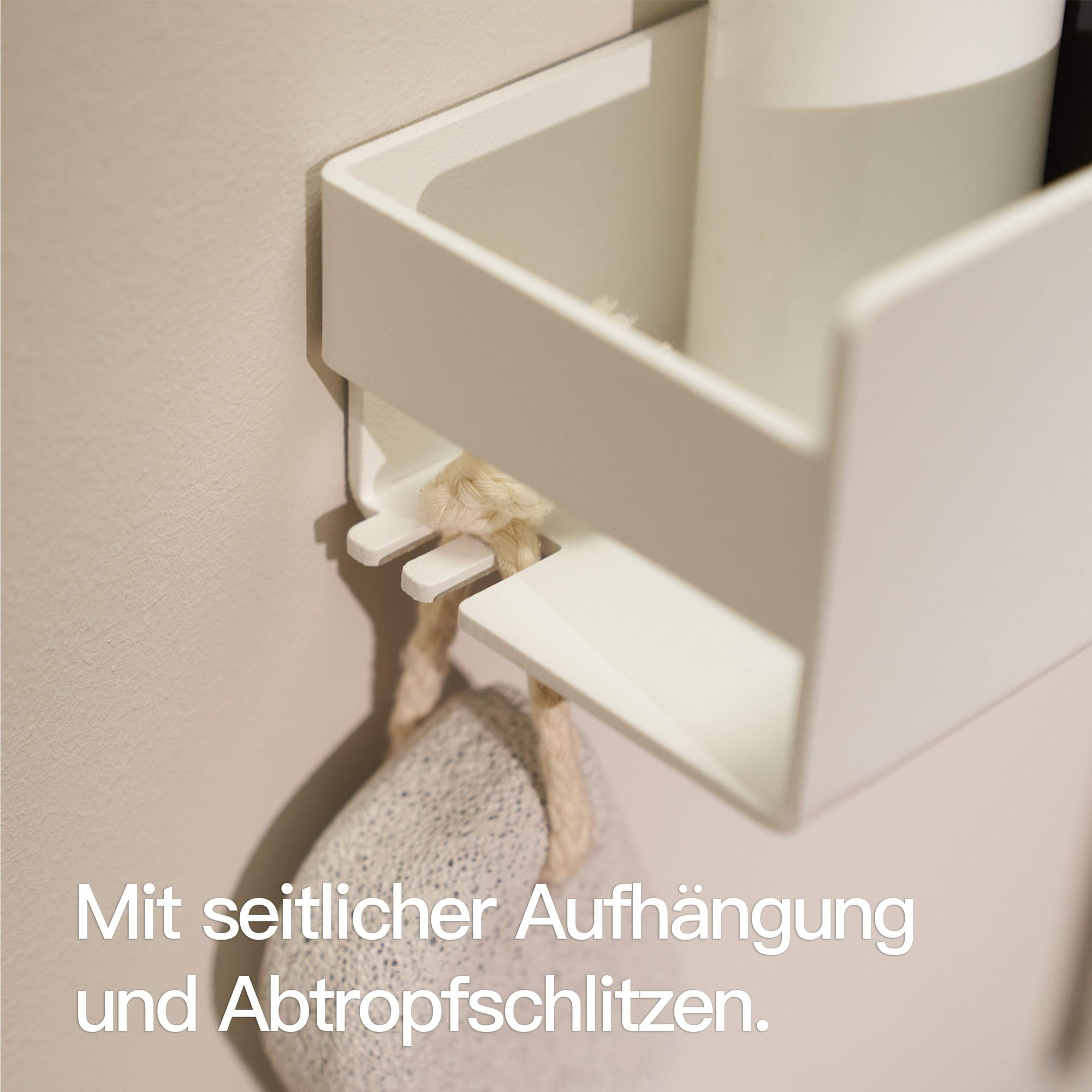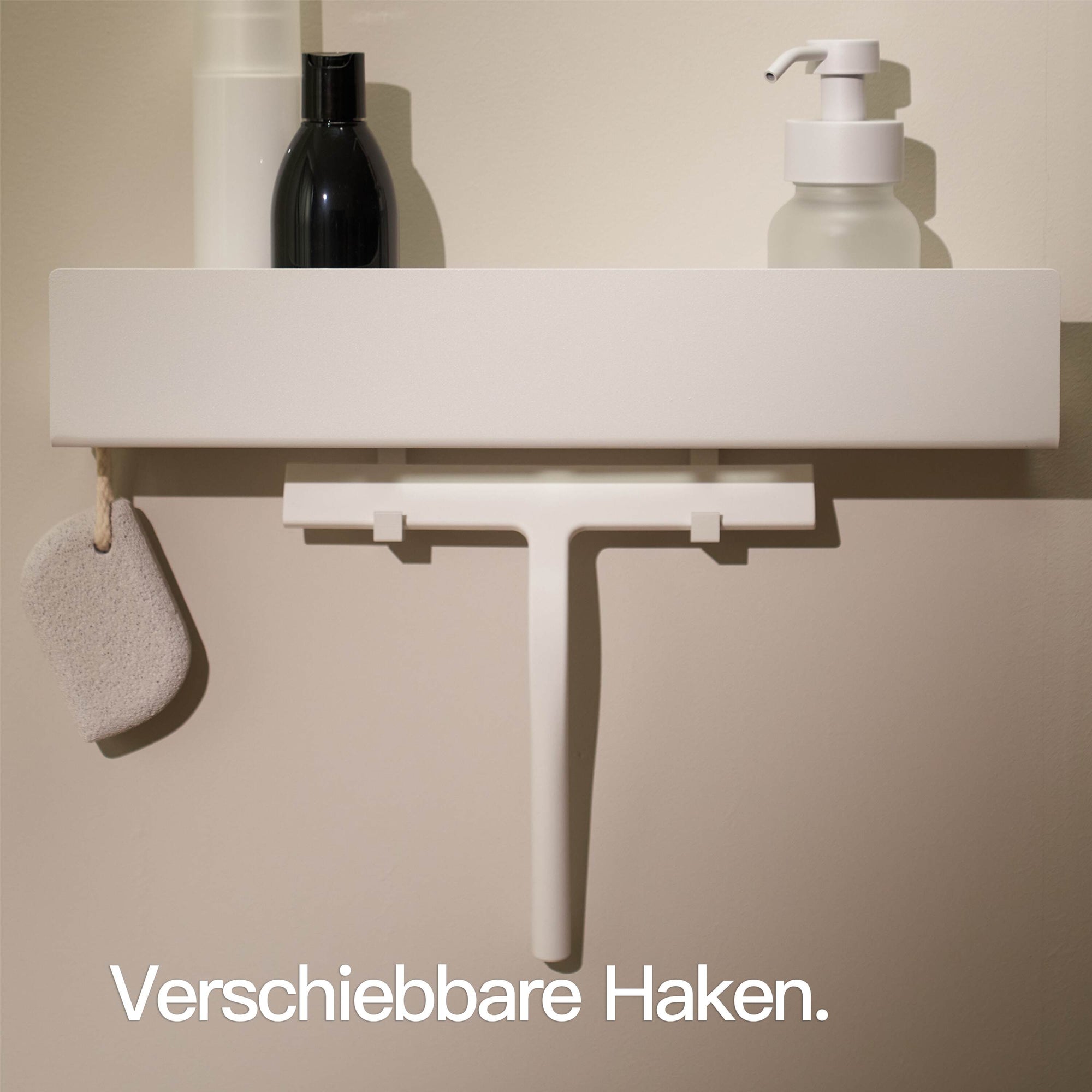 Das weiße Duschregal verfügt über zwei Ablaufschlitze und eine Schiene, in der du die zwei beiliegenden Haken frei bewegen kannst. Ob Duschabzieher oder andere Utensilien – mit den verschiebbaren Haken schaffst du dir sinnvollen Stauraum. Kleinere Utensilien wie Schwämme und Bürsten kannst du einfach an den seitlichen Aufhängeschlitzen aufhängen, egal ob links oder rechts. Und damit deine Shampooflaschen nicht aus dem Regal fallen, haben wir seitlich dezente Flanken eingebaut.
