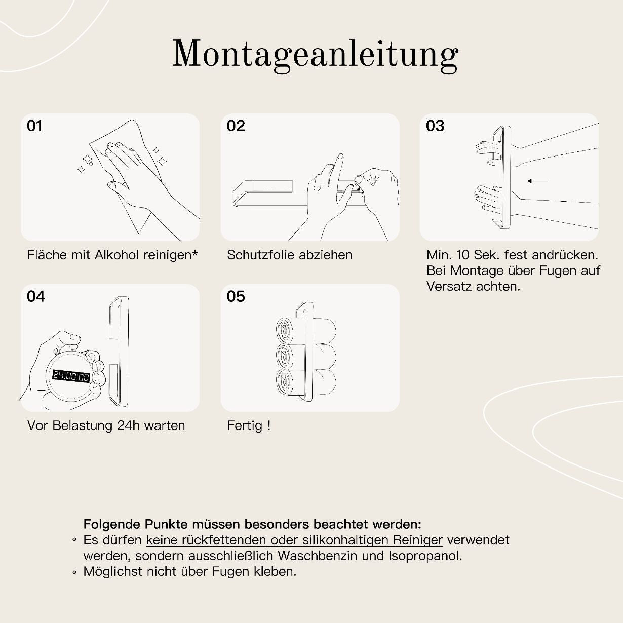 In vier einfachen Schritten ist dein Gästehandtuchhalter ohne Bohren Weiß von Designfabrik Hamburg installiert. Hier erfährst du wie! ❯❯