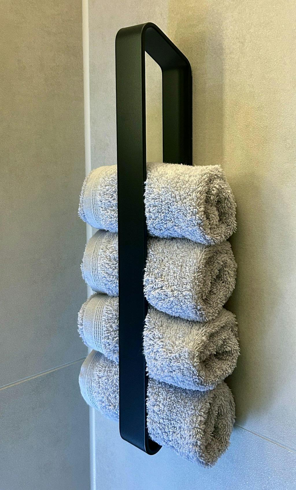 Dank der vertikalen Ausrichtung eignet sich dieses Modell hervorragend für Gästehandtücher, kleine Badtextilien oder als platzsparende Lösung in kleineren Räumen. Kombiniere mehrere Halter für ein harmonisches Gesamtbild.