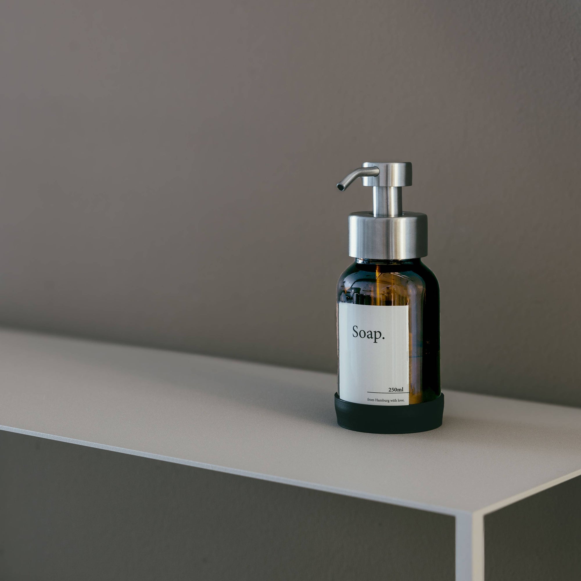 Jedes Detail unseres Badezimmers ist sorgfältig durchdacht, um eine moderne und wohnliche Atmosphäre zu schaffen. Eine gewöhnliche Kunststoffflasche passt einfach nicht dazu. Daher haben wir uns auf zeitlose Formen, hochwertige Materialien und raffinierte Oberflächenbehandlungen konzentriert, um einen echten Blickfang neben dem Waschbecken zu schaffen. Wir sind überzeugt, dass uns das gelungen ist.