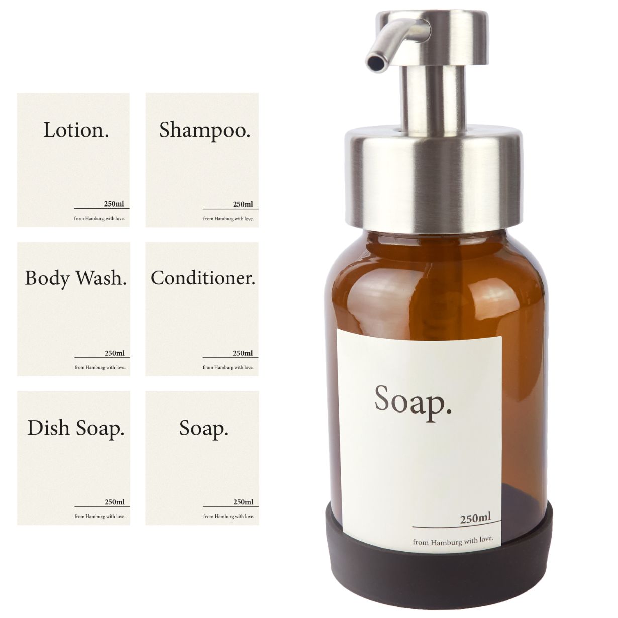 Möchtest du unseren Seifenspender aus Glas in der Küche, der Dusche oder im Badezimmer verwenden? Kein Problem! Die passenden Etiketten für Soap, Shampoo, Lotion, Dish Soap, Conditioner und Body Soap liegen bereits bei.