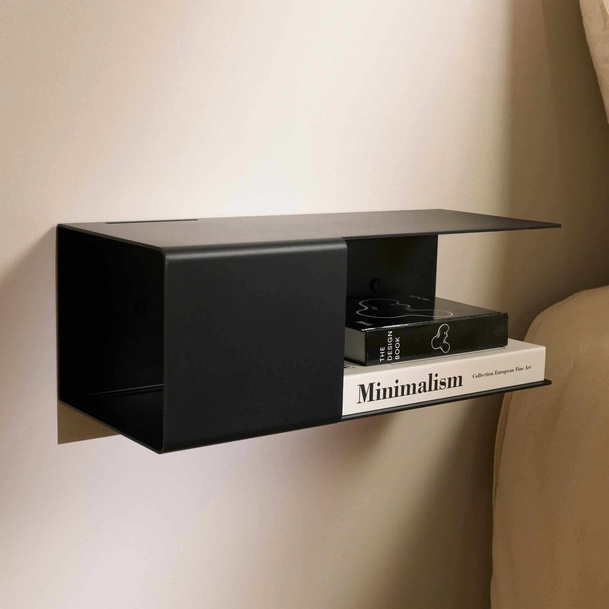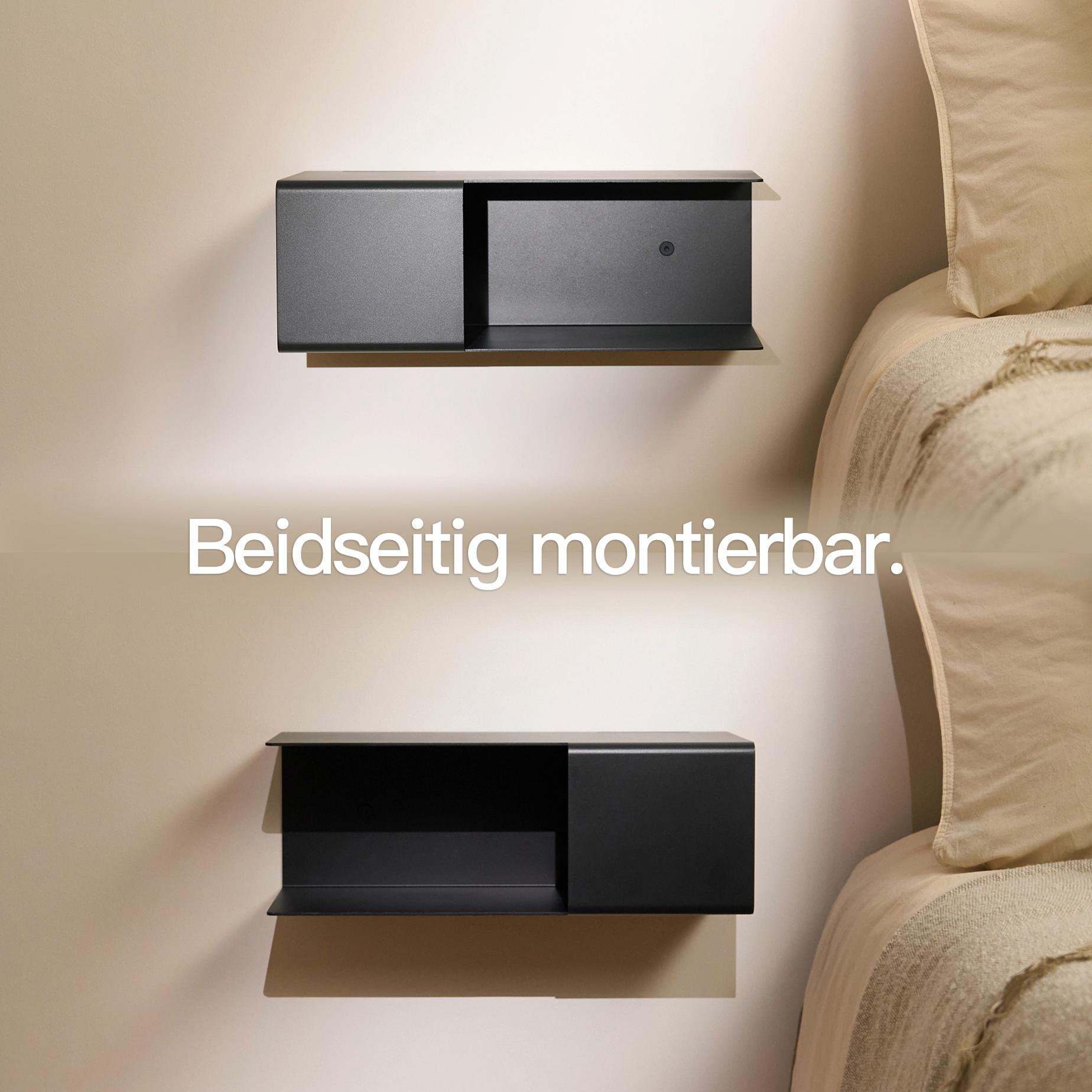 Gefertigt aus 3 mm starkem Aluminium und veredelt mit einer hochwertigen Pulverbeschichtung, wirkt er nicht nur besonders klar und reduziert, sondern überzeugt auch durch seine stabile, langlebige Ausführung. Die wandmontierte Konstruktion lässt den Boden frei und verleiht dem wandmontierten Nachtschrank eine leichte, fast schwebende Optik.