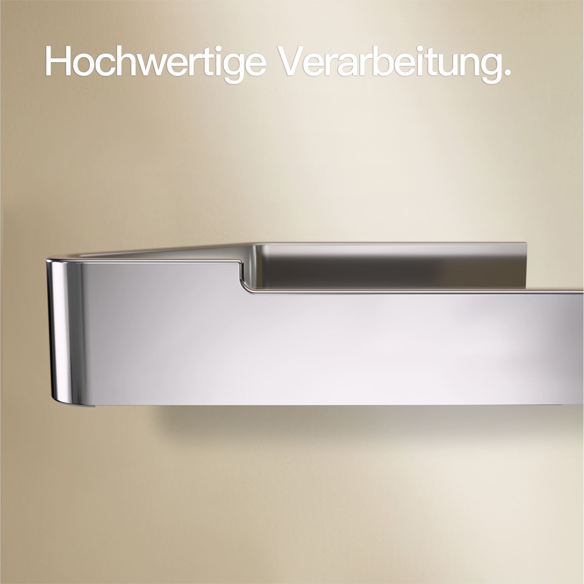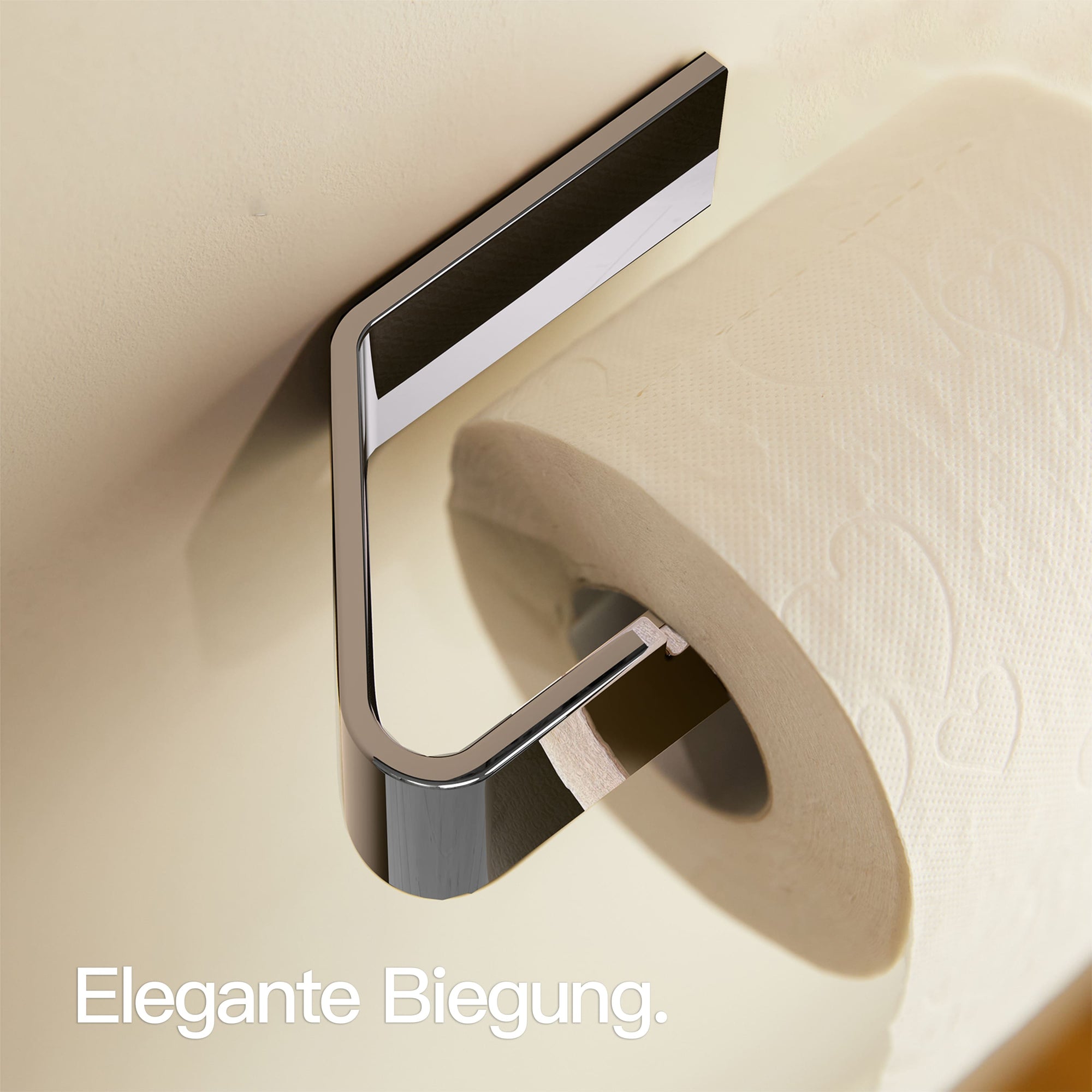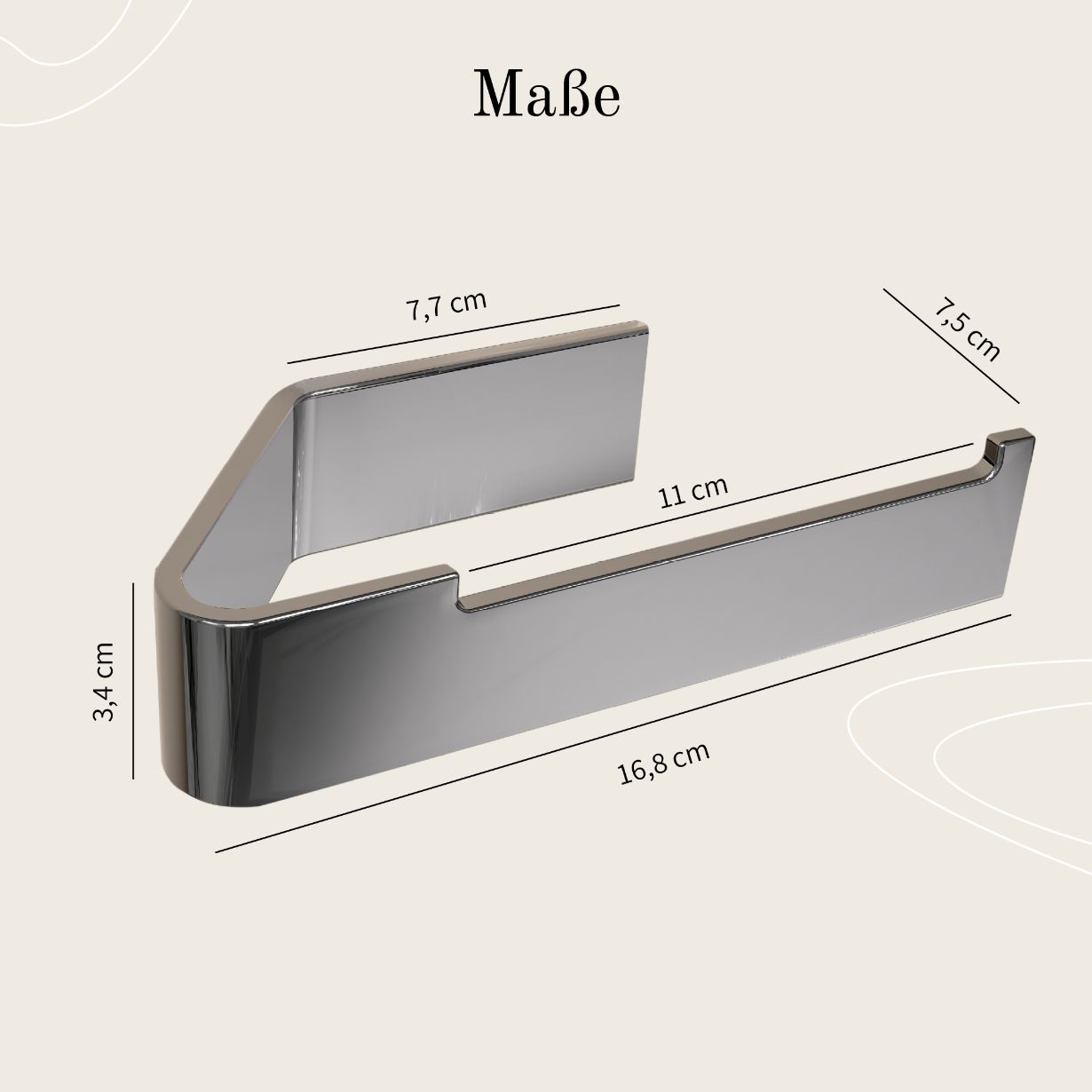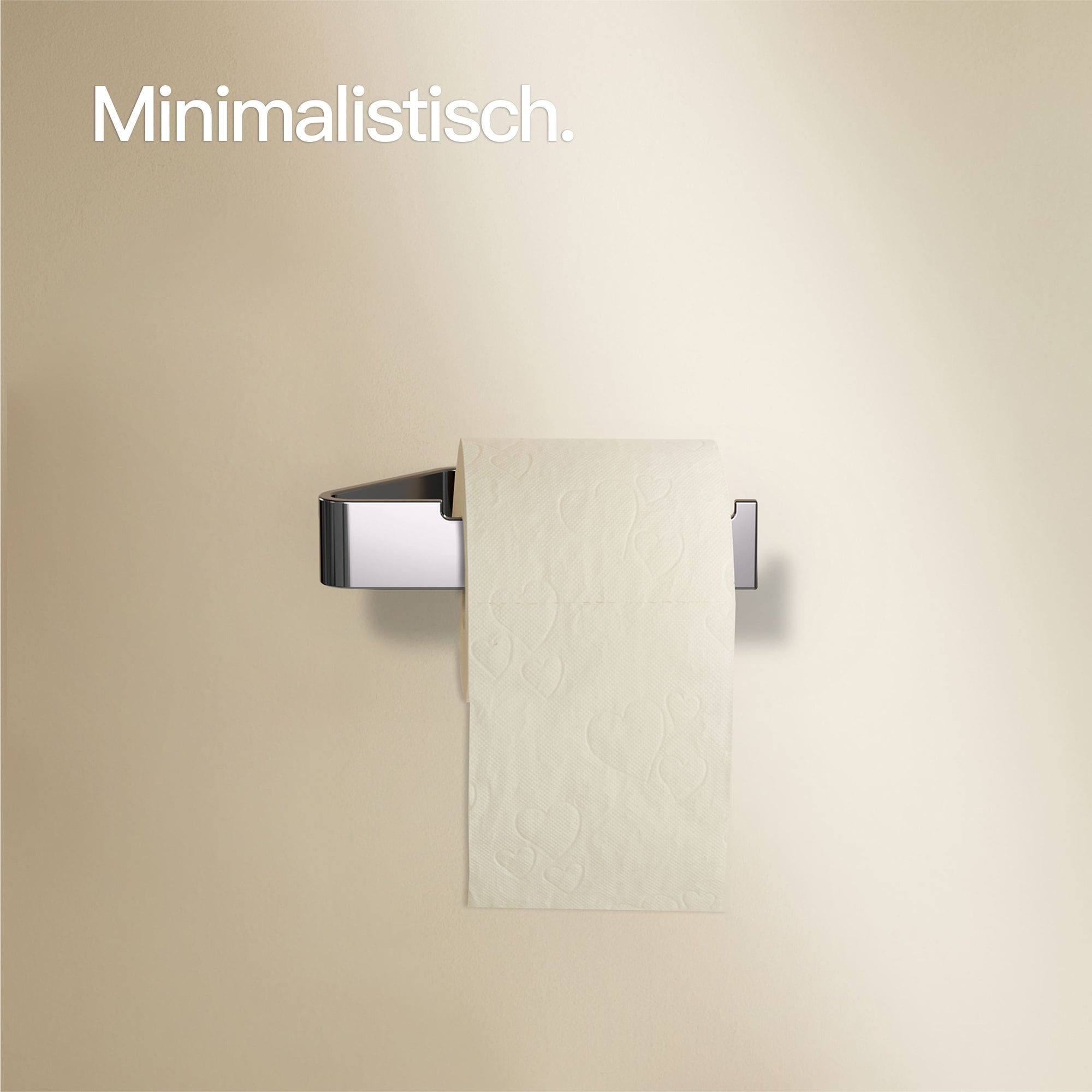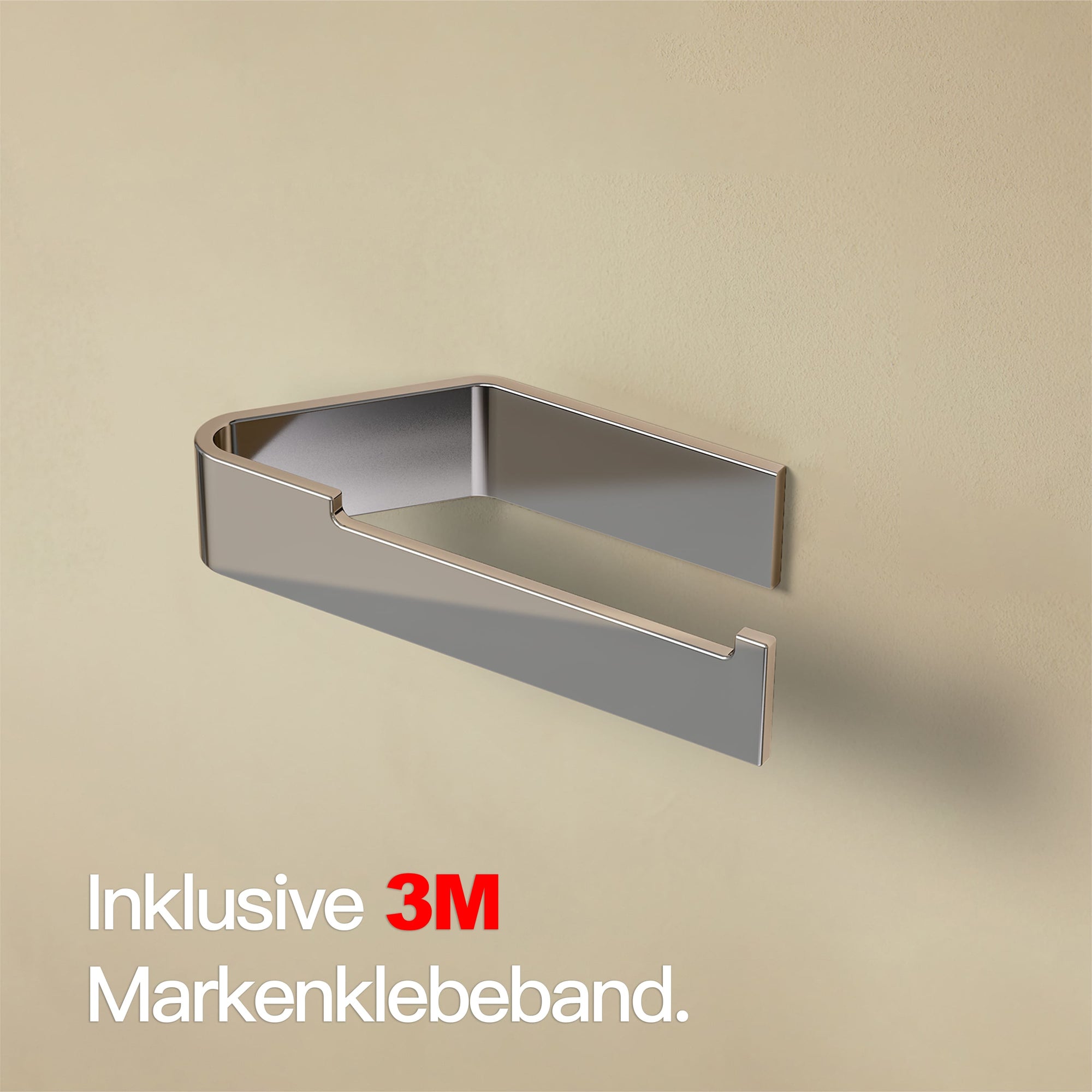 Ein innovativer Toilettenpapierhalter in modernem, minimalistischem Design, präzise gefertigt aus einem einzigen Metallstück. Die Kanten sind kunstvoll CNC-gefräst, was für eine saubere und dennoch außergewöhnliche Optik sorgt. Darf ich vorstellen: Unser selbstklebender, verchromter Klopapierhalter.
